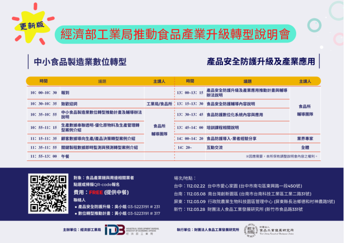 內容:經濟部工業局提供資源以「產品安全防護升級及產業應用推動計畫」協助食品產業鏈接軌國際食品安全管理或品質優化。另同時推出「中小食品製造業數位轉型推動計畫」,協助業者透過數位能力的導入,改善企業流程與商業模式,厚實企業競爭力。