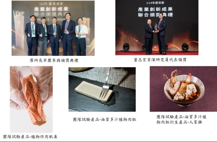 本所植物肉產品研發團隊榮獲114年度第9屆經濟部國家產業創新獎-團隊創新領航(學研專案組)殊榮,於114年6月10日於臺大醫院國際會議中心接受經濟部頒獎表揚,廖所長親自率團參與頒獎典禮,並由計畫主持人董志宏資深研究員代表領獎。