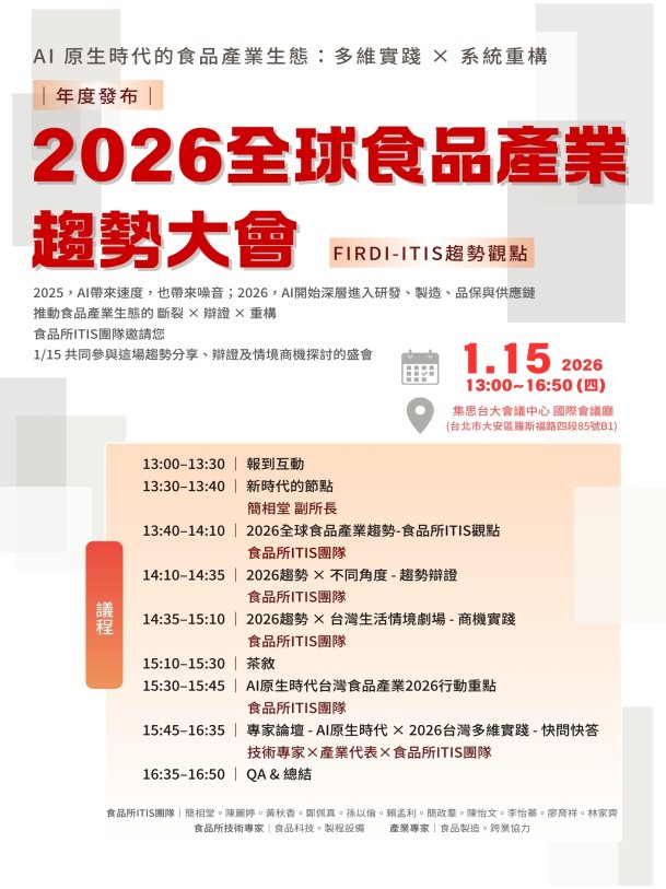 ※主辦單位得視情況保留議程變更權利;異動後議程以食品所網站公告為主。