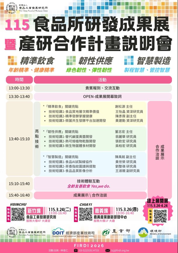 財團法人食品工業發展研究所執行經濟部、農業部及環境部相關計畫,將於本次說明會展示115年度先期參與技術及114年度可移轉研發成果,誠摯邀請各界蒞臨交流與洽談合作。