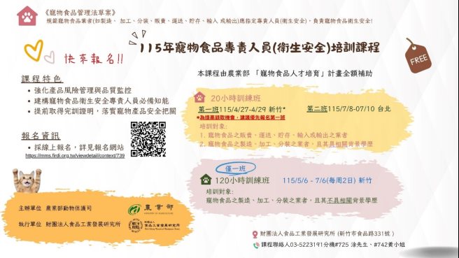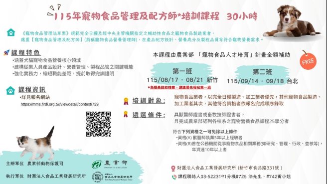 因應《寵物食品管理法》草案規範,培育寵物食品管理及配方之專業人才。課程聚焦配方設計、營養管理與衛生安全,協助業者培養專責人員,強化產品品質與產業競爭力。